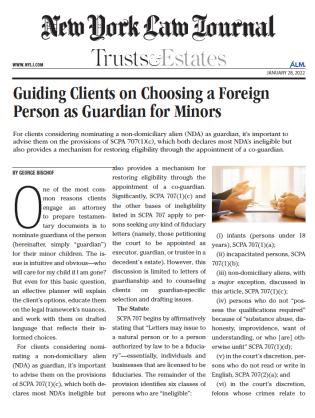 For clients considering nominating a non-domiciliary alien (NDA) as guardian, it’s important to advise them on the provisions of SCPA 707(1)(c), which both declare most NDA’s ineligible but also provide a mechanism for restoring eligibility through the appointment of a co-guardian.